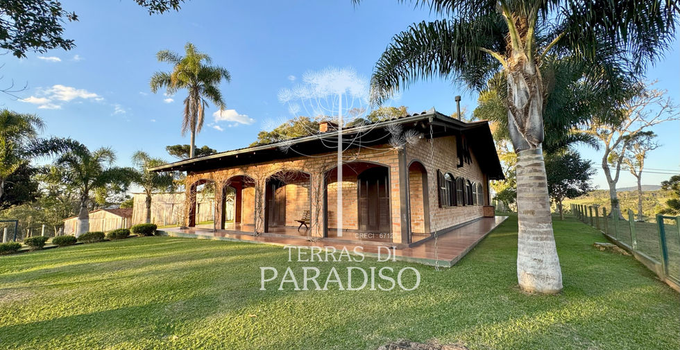 Possui bela casa rústica, toda em tijolos aparente e com estrutura com madeira de lei, vista panorâmica para belas araucárias. Imóvel todo mobiliado e finamente decorado, muito arejado, com área construída de 200 m². O terreno possui área total de 10.000 m², com frente de 90 metros de frente para rodovia.